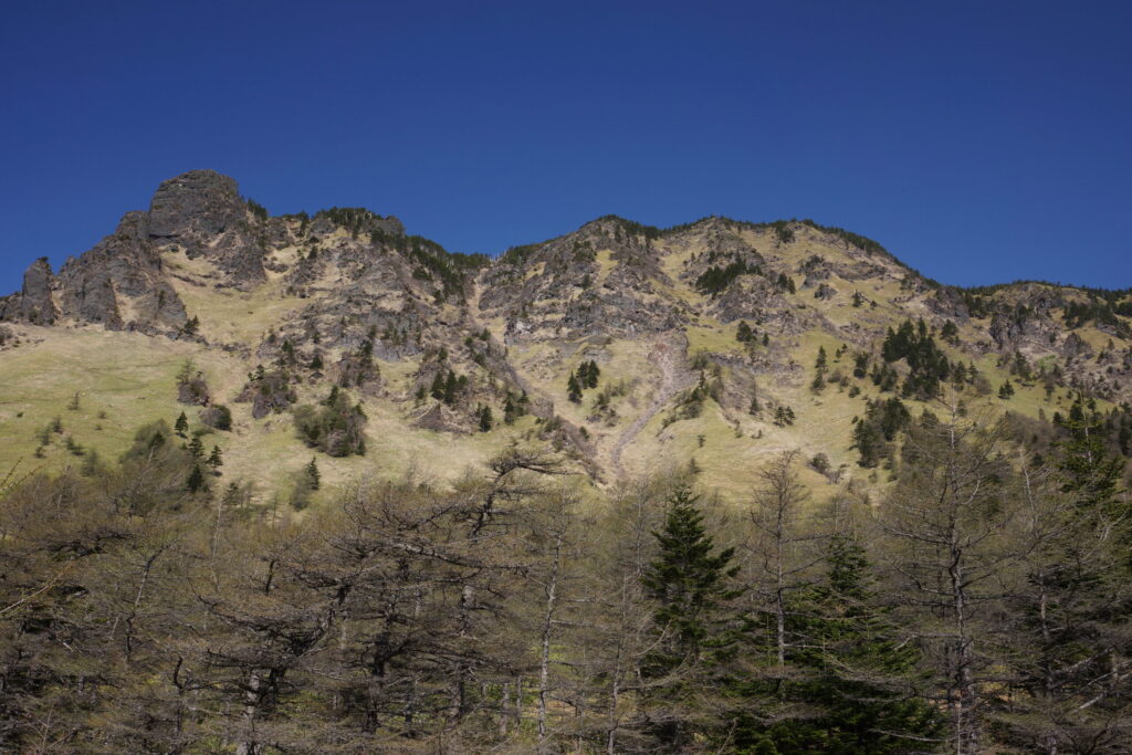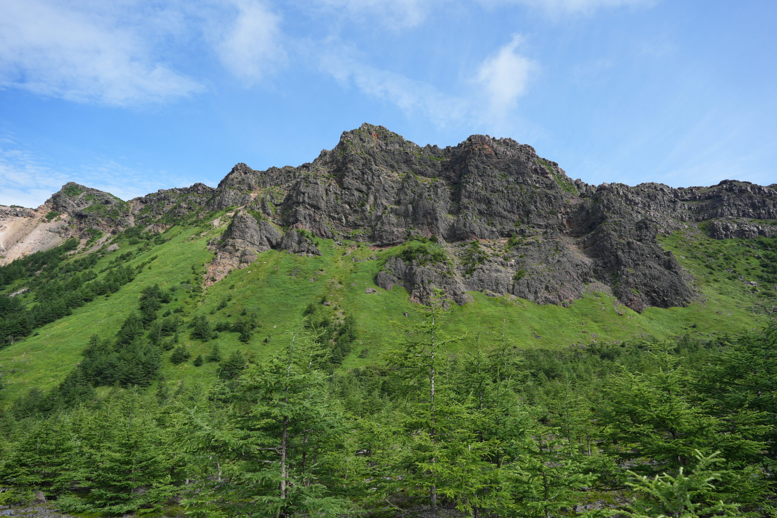 浅間山の麓、トーミの頭から草すべり下った湯の平より。岩峰と緑が美しい。